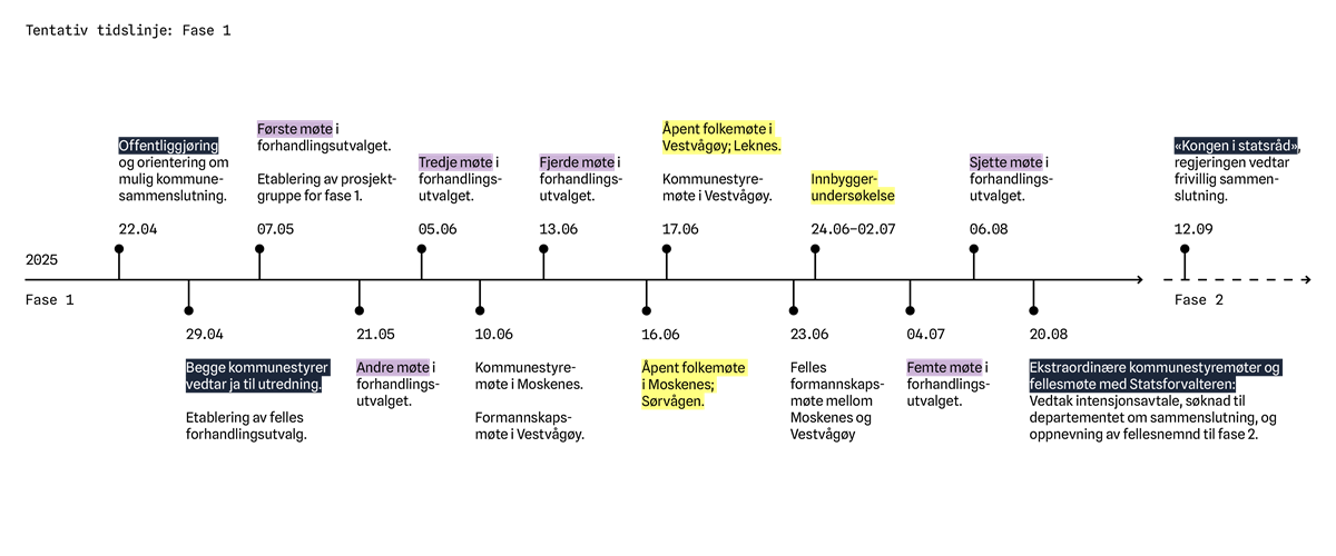 Tid og aktiviteterVilje og en lengre modningsprosess hos folkevalgte, ansatte og innbyggere muliggjør en effektiv og stram tidsplan for sammenslutningen. Sist endret 26.11.2025 11.00 På denne siden finner du: Møteplan fellesnemndaFor møteplan, sakskart, møteprotokoll og medlemmer, gå til:Møteplan Fellesnemnd Kommende aktiviteter15. desember 2025 – Møte i FellesnemndaSak kommer. Tidligere aktiviteter (fase 2)17. november 2025 – Møte i FellesnemndaFor sak, behandling og protokoll, gå til: Møte i Fellesnemnda (17.11.2025) Tidligere aktiviteter (fase 1)12. september 2025 – Kongen i statsrådKommunene har vedtatt å søke staten om frivillig sammenslutning. Endelig vedtak gjøres hos Kongen i statsråd – som ventes like etter stortingsvalget, og før ny regjering konstitueres. «Kongen i statsråd» er møtet hvor regjeringen under ledelse av Hans Majestet Kongen samles og treffer avgjørelse.8. september 2025 – Rådgivende folkeavstemming i FlakstadFlakstad kommune gjennomfører en rådgivende folkeavstemming samtidig som stortingsvalget 8. september, om de vil gå inn i prosessen med mulig kommunesammenslutning. Resultatet ble 285 stemmer for, 280 mot og 3 blanke stemmer.Flakstad er invitert med i prosessen sammen med Moskenes og Vestvågøy. Det er et ønske om at de blir integrert med så tidlig som mulig, av hensyn til pågående utvikling, omstillinger og arbeidprosesser.25. august 2025 – Kommunal- og distriktsministeren på besøk i LofotenStatsråd Kjersti Stenseng besøker Vestvågøy, Moskenes og Flakstad kommune. 20. august 2025 – Kommunestyremøter og fellesmøte med StatsforvalterenDagen deles opp i tre forskjellige møter. Sakspapirene er like, men innstillingen skiller de tre.Kommunestyremøter (adskilt): To adskilte kommunestyremøter, med likelydende saker. Moskenes kommunestyre møtes i formannskapssalen, og Vestvågøy kommunestyre i kommunestyresalen. Begge møter avholdes på Vestvågøy rådhus på Leknes.Saker: Intensjonsavtalen, søknad om sammenslutning til Kommunal- og distriktsdepartementet (KDD). Felles drøftingsmøte (med Statsforvalteren): Lage innstilling til tredje møte. Kommunestyrene møtes til et felles møte sammen med Statsforvalteren. Møtested: kommunestyresalen på Leknes. Her drøftes sakene som beskrevet under, men det gjøres ikke endelig vedtak. Til drøfting: Valg av møteleder for møtet, forslag til kommunenavn, antall medlemmer i det nye kommunestyret, valg av fellesnemd, valg av revisor, opprettelse av eventuelle andre fellesorganer (eksempelvis partssammensatt utvalg). Kommunestyremøter (samtidig): Oppsummerer momentene fra drøftingsmøtet som legges frem som innstilling til endelig vedtak. Deretter settes det to kommunestyrer i samme møterom. Begge behandler den samme saken, men det kjøres avstemming hver for seg.06. august 2025 – Møte i forhandlingsutvalgetForhandlingsutvalget og prosjektgruppa hadde møte på Reine.Møtereferat: Forhandlingsutvalget 06. august 2025 (PDF, 137 kB)04. juli 2025 – Møte i forhandlingsutvalgetMøtereferat: Forhandlingsutvalget 04. juli 2025 (PDF, 143 kB)24. juni–02. juli 2025 – InnbyggerundersøkelseMellom tirsdag 24. juni–onsdag 02. juli ble det gjennomført en telefonundersøkelse i Moskenes og Vestvågøy fra Respons Fakta, på vegne av forhandlingsutvalget.Resultat innbyggerundersøkelsenIntervjuet besto av 4 spørsmål og noen bakgrunnsspørsmål. Til sammen tok det 5–6 minutter å svare. Alle tilbakemeldinger behandles anonymt.Illustrasjonsbilde Unsplash / Timur Repin Forhandlingsutvalget har valgt en kombinasjon mellom folkemøter, innbyggerundersøkelse og digitale innspillsskjemaer for å enklere inkludere barn, unge og andre grupper som ikke er stemmeberettigede – samt at det muliggjør en mer aktiv dialog og medvirkning fra innbyggerne. 23. juni 2025 – Felles formannskapsmøteFelles formannskapsmøte på Reine, mellom Moskenes og Vestvågøy kommuner. Tilstede var også forhandlingsutvalget, prosjektgruppa og Statsforvalteren i Nordland, Tom Cato Karlsen.Felles formannskapsmøte for Vestvågøy og Moskenes, forhandlingsutvalget, prosjektgruppa og Statsforvalteren i Nordland. nykommuneilofoten.no v/ Ida Christensen Livestrømming av møtetSaksliste: Gjennomgang av prosessen så langt.Gjennomgang av kommunikasjonsplan, faktagrunnlag (utkast) og spørreskjema til innbyggerundersøkelse.Gjennomgang og drøfting av forhandlingsutvalgets utredning (unntatt offentlighet)Grunnet separate arkivsystemer finnes det to ulike lenker til de samme sakspapirene:Moskenes kommune: FormannskapsmøteVestvågøy kommune: Formannskapsmøte16. og 17. juni 2025 – FolkemøterDet arrangeres åpne folkemøter for alle interesserte. Tilstede er ordførere og representanter fra begge kommuner. Vi håper så mange som mulig ønsker å komme, og vi blir veldig glade for tilbakemeldinger og konstruktive innspill – det hjelper oss å tilpasse prosessen og videreformidle relevant informasjon videre.Moskenes: Mandag 16. juni kl. 19:00, på Sørvågen skole.Vestvågøy: Tirsdag 17. juni kl. 19:00, på rådhuset på Leknes.Åpent folkemøte med informasjon, spørsmål og tilbakemeldinger. Til stede var representanter fra forhandlingsutvalget og prosjektgruppa, fra begge kommuner. nykommuneilofoten.no v/Ida Christensen Dagsordenen for møtene er tredelt: Informere om pågående prosess.Innspill, drøfting og argumenter for og imot en kommunesammenslutning.Åpen kanal for å ta opp det man måtte ønske (spørsmål og svar).Mer info: Aktuelt13. juni 2025 – Møte i forhandlingsutvalgetMøtereferat: Forhandlingsutvalget 13. juni 2025 (PDF, 152 kB)05. juni 2025 – Møte i forhandlingsutvalgetMøtereferat: Forhandlingsutvalget 05. juni 2025 (PDF, 165 kB)21. mai 2025 – Møte i forhandlingsutvalgetMøtereferat: Forhandlingsutvalget 21. mai 2025 (PDF, 152 kB)07. mai 2025 – Møte i forhandlingsutvalgetMøtereferat: Forhandlingsutvalget 7. mai 2025 (PDF, 120 kB)29. april 2025 – Begge komm