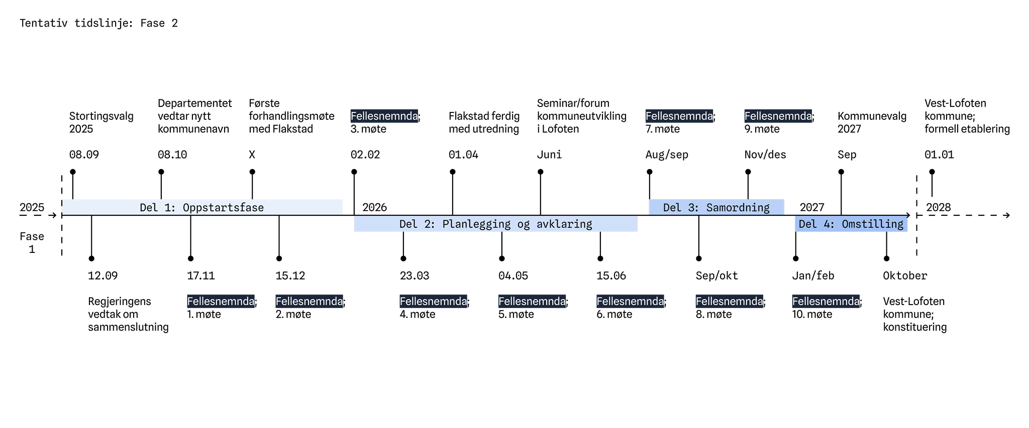 Tid og aktiviteterVilje og en lengre modningsprosess hos folkevalgte, ansatte og innbyggere muliggjør en effektiv og stram tidsplan for sammenslutningen. Sist endret 22.12.2025 12.20 På denne siden finner du: Møteplan fellesnemndaFor møteplan, sakskart, møteprotokoll og medlemmer, gå til:Møteplan Fellesnemnd Kommende aktiviteter02. februar 2026 – Møte i FellesnemndaTredje møte i Fellesnemnda. Sak kommer.23. mars 2026 – Møte i FellesnemndaFjerde møte i Fellesnemnda. Sak kommer.04. mai 2026 – Møte i FellesnemndaFemte møte i Fellesnemnda. Sak kommer.15. juni 2026 – Møte i FellesnemndaSjette møte i Fellesnemnda. Sak kommer. Tidligere aktiviteter (fase 2)15. desember 2025 – Forhandlingsmøte med FlakstadFørste møte mellom Forhandlingsutvalget for Vest-Lofoten og Forhandlingsutvalget for Flakstad. Kommunestyret i Flakstad har opprettet et eget forhandlingsutvalg som skal se på både fordeler og ulemper ved en eventuell sammenslutning med Vestvågøy og Moskenes – til nye Vest-Lofoten kommune.Representanter fra forhandlingsutvalget Flakstad:Einar Benjaminsen, ordfører Flakstad og leder av forhandlingsutvalget.Julie Hellan Larsen, varaordfører Flakstad.Trond Kroken, kommunestyremedlem Flakstad (ikke til stede).Per Øyvind Sundell, prosjektleder og kommunedirektør Flakstad.15. desember 2025 – Møte i FellesnemndaFor sak, behandling og protokoll, gå til: Møte i Fellesnemnda (15.12.2025)17. november 2025 – Møte i FellesnemndaFor sak, behandling og protokoll, gå til: Møte i Fellesnemnda (17.11.2025) Milepælene på figuren nedenfor er beskrevet i aktivitetslisten over. Tidligere aktiviteter (fase 1)12. september 2025 – Kongen i statsrådKommunene har vedtatt å søke staten om frivillig sammenslutning. Endelig vedtak gjøres hos Kongen i statsråd – som ventes like etter stortingsvalget, og før ny regjering konstitueres. «Kongen i statsråd» er møtet hvor regjeringen under ledelse av Hans Majestet Kongen samles og treffer avgjørelse.8. september 2025 – Rådgivende folkeavstemming i FlakstadFlakstad kommune gjennomfører en rådgivende folkeavstemming samtidig som stortingsvalget 8. september, om de vil gå inn i prosessen med mulig kommunesammenslutning. Resultatet ble 285 stemmer for, 280 mot og 3 blanke stemmer.Flakstad er invitert med i prosessen sammen med Moskenes og Vestvågøy. Det er et ønske om at de blir integrert med så tidlig som mulig, av hensyn til pågående utvikling, omstillinger og arbeidprosesser.25. august 2025 – Kommunal- og distriktsministeren på besøk i LofotenStatsråd Kjersti Stenseng besøker Vestvågøy, Moskenes og Flakstad kommune. 20. august 2025 – Kommunestyremøter og fellesmøte med StatsforvalterenDagen deles opp i tre forskjellige møter. Sakspapirene er like, men innstillingen skiller de tre.Tredje møte i kommunestyret (20.08.2025)Kommunestyremøter (adskilt): To adskilte kommunestyremøter, med likelydende saker. Moskenes kommunestyre møtes i formannskapssalen, og Vestvågøy kommunestyre i kommunestyresalen. Begge møter avholdes på Vestvågøy rådhus på Leknes.Saker: Intensjonsavtalen, søknad om sammenslutning til Kommunal- og distriktsdepartementet (KDD). Felles drøftingsmøte (med Statsforvalteren): Lage innstilling til tredje møte. Kommunestyrene møtes til et felles møte sammen med Statsforvalteren. Møtested: kommunestyresalen på Leknes. Her drøftes sakene som beskrevet under, men det gjøres ikke endelig vedtak. Til drøfting: Valg av møteleder for møtet, forslag til kommunenavn, antall medlemmer i det nye kommunestyret, valg av fellesnemd, valg av revisor, opprettelse av eventuelle andre fellesorganer (eksempelvis partssammensatt utvalg). Kommunestyremøter (samtidig): Oppsummerer momentene fra drøftingsmøtet som legges frem som innstilling til endelig vedtak. Deretter settes det to kommunestyrer i samme møterom. Begge behandler den samme saken, men det kjøres avstemming hver for seg.06. august 2025 – Møte i forhandlingsutvalgetForhandlingsutvalget og prosjektgruppa hadde møte på Reine.Møtereferat: Forhandlingsutvalget 06. august 2025 (PDF, 137 kB)04. juli 2025 – Møte i forhandlingsutvalgetMøtereferat: Forhandlingsutvalget 04. juli 2025 (PDF, 143 kB)24. juni–02. juli 2025 – InnbyggerundersøkelseMellom tirsdag 24. juni–onsdag 02. juli ble det gjennomført en telefonundersøkelse i Moskenes og Vestvågøy fra Respons Fakta, på vegne av forhandlingsutvalget.Resultat innbyggerundersøkelsenIntervjuet besto av 4 spørsmål og noen bakgrunnsspørsmål. Til sammen tok det 5–6 minutter å svare. Alle tilbakemeldinger behandles anonymt.Illustrasjonsbilde Unsplash / Timur Repin Forhandlingsutvalget har valgt en kombinasjon mellom folkemøter, innbyggerundersøkelse og digitale innspillsskjemaer for å enklere inkludere barn, unge og andre grupper som ikke er stemmeberettigede – samt at det muliggjør en mer aktiv dialog og medvirkning fra innbyggerne. 23. juni 2025 – Felles formannskapsmøteFelles formannskapsmøte på Reine, mellom Moskenes og Vestvågøy kommuner. Tilstede var også forhandlingsutvalget, prosjektgruppa og Statsforvalteren i Nordland, Tom Cato Karlsen.Felles formannskapsmøte for Vestvågøy og Moskenes, forhandlingsutvalget, prosjektgruppa og Statsforvalteren i Nordland. nykommuneilofoten.no v/ Ida Christensen Livestrømming av møtetSaksliste: Gjennomgang av prosessen så langt.Gjennomgang av kommunikasjonsplan, faktagrunnlag (utkast) og spørreskjema til innbyggerundersøkelse.Gjennomgang og drøfting av forhandlingsutvalgets utredning (unntatt offentlighet)Grunnet separate arkivsystemer finnes det to ulike lenker til de samme sakspapirene:Moskenes kommune: FormannskapsmøteVestvågøy kommune: Formannskapsmøte16. og 17. juni 2025 – FolkemøterDet arrangeres åpne folkemøter for alle interesserte. Tilstede er ordførere og representanter fra begge kommuner. Vi håper så mange som mulig ønsker å komme, og vi blir veldig glade for tilbake